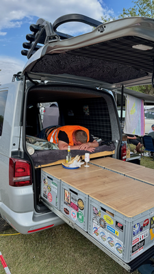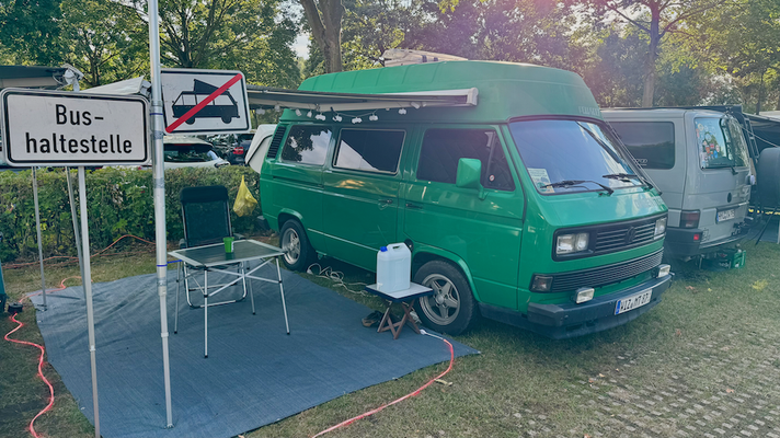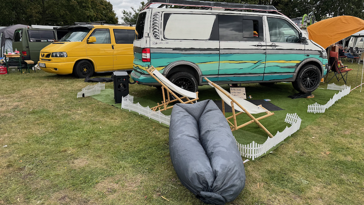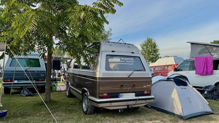 Chaotisch verlief zudem der Start am Donnerstagmorgen. Die Polizei hatte den Veranstaltern kurzfristig untersagt, die Warteschlangen an den Eingängen A bis D auf der Straße stehen zu lassen. Verständlich zwar, aber man hätte das im Vorfeld absprechen können. Am Ende wurden die Bullis für Eingang B über den Parkplatz P2 geleitet, der als eine Art Warteschleife diente. Doch die Zufahrt zum P2 war steil, manche Busse setzten auf, der Boden war matschig und es roch streng nach Kuhmist. Zudem kamen die Fahrzeuge nicht so schnell vom Parkplatz P2 wieder weg in Richtung Einfahrt Gelände B, wie sie locker im Gelände B hätten einfahren können. In der Spitze bedeutete das bis zu vier Stunden Wartezeit. Ein Bekannter von mir, der extra schon in der Nacht zuvor angereist war, hoffte, am Donnerstagmorgen um acht Uhr aufs Gelände zu kommen. Tatsächlich kam er erst um 11:30 Uhr hinein.