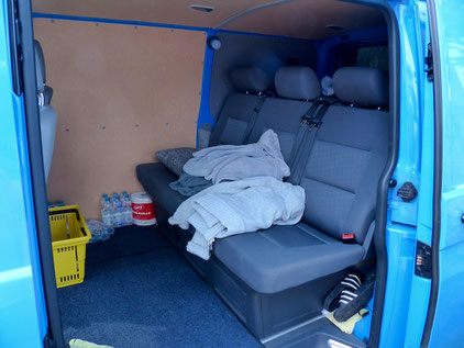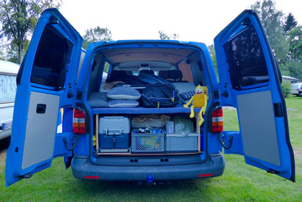 Carstens Kasten hat Carsten zu einem Camper umgebaut. Hinten sind Kühlbox und Bett sowie viel Stauraum zu erkennen.