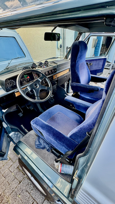 Taubengrau – und innen das blaue Velours, das man nur ganz selten findet. Leider hat auch dieser wieder eine Handschaltung statt Automatik, aber irgendwas ist ja immer. Klima fehlt, wird aber demnächst eingebaut.