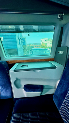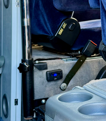 Seitlich neben dem neuen Tischfuß am Fahrersitz habe ich außerdem eine kleine, dezente Anzeige verbaut. Darüber kann ich USB-A und USB-C nutzen, zum Beispiel zum Aufladen des Handys. Zusätzlich zeigt mir die Anzeige auch die aktuelle Spannung der Beifahrerbatterie an. Ein echter Mehrwert – und dabei sehr unauffällig eingebaut.