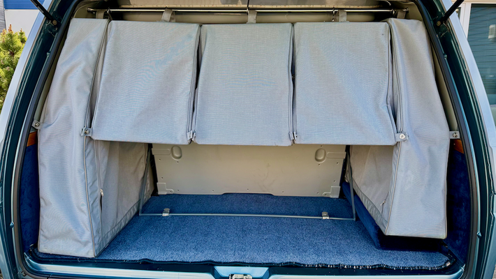 Von hinten sieht man die fünf Tuchschränke. Den mittleren lasse ich aber immer zu Hause, damit ich auch noch durch die Heckscheibe ein wenig den nachfolgenden Verkehr beobachten kann. Viele machen das ja nur über die Außenspiegel, aber für mich ist ein direkter Blick nach hinten ganz sinnvoll.