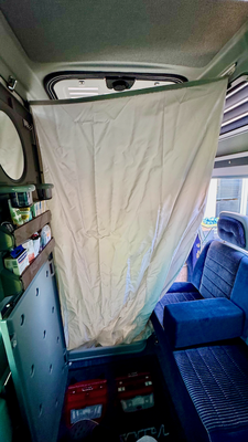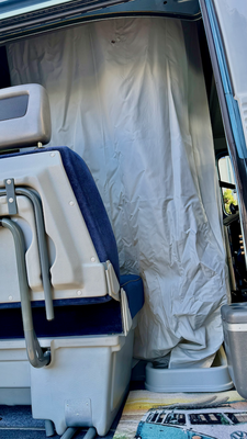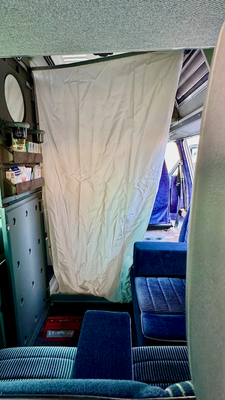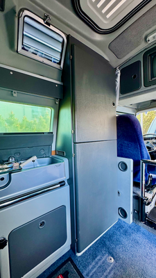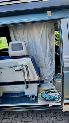 Die Möbel sind rissfrei, und für diese Fotos habe ich die Duschtasse eingebaut und den neuen Vorhang mal so platziert, wie man es beim Duschen macht. Sieht schon ganz witzig aus. Mal schauen, ob ich tatsächlich mal darin dusche – sozusagen zur Einweihung des Busses. Dafür müsste allerdings erst die Frischwasserversorgung funktionieren. Die Armatur ist aktuell nicht in Ordnung.